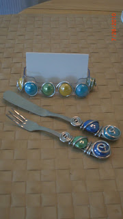 Here is Stephanie, a local artisan and one of my new friends from the Marina. She and her colleague do amazing, beautiful handcrafted and beaded wire work and so much more. She has a vast array of home decor items and kitchen items with gorgeous beads and wiring. You can see just a small array of what she produces here in the photo...it includes serving plates, bowls, cutlery, flatware, wine glasses, vases, and so much more. They sell not only here, but also in craft shows around the state. She has kindly donated a beaded 2 piece flatware set, just in time for the holidays. In the photo you will also see a card holder I received from her. ( if anyone would like to place an order for any of these items or beaded wine glasses, please let me know in the comment section and ask for more information, and I will pass the message on to her.)